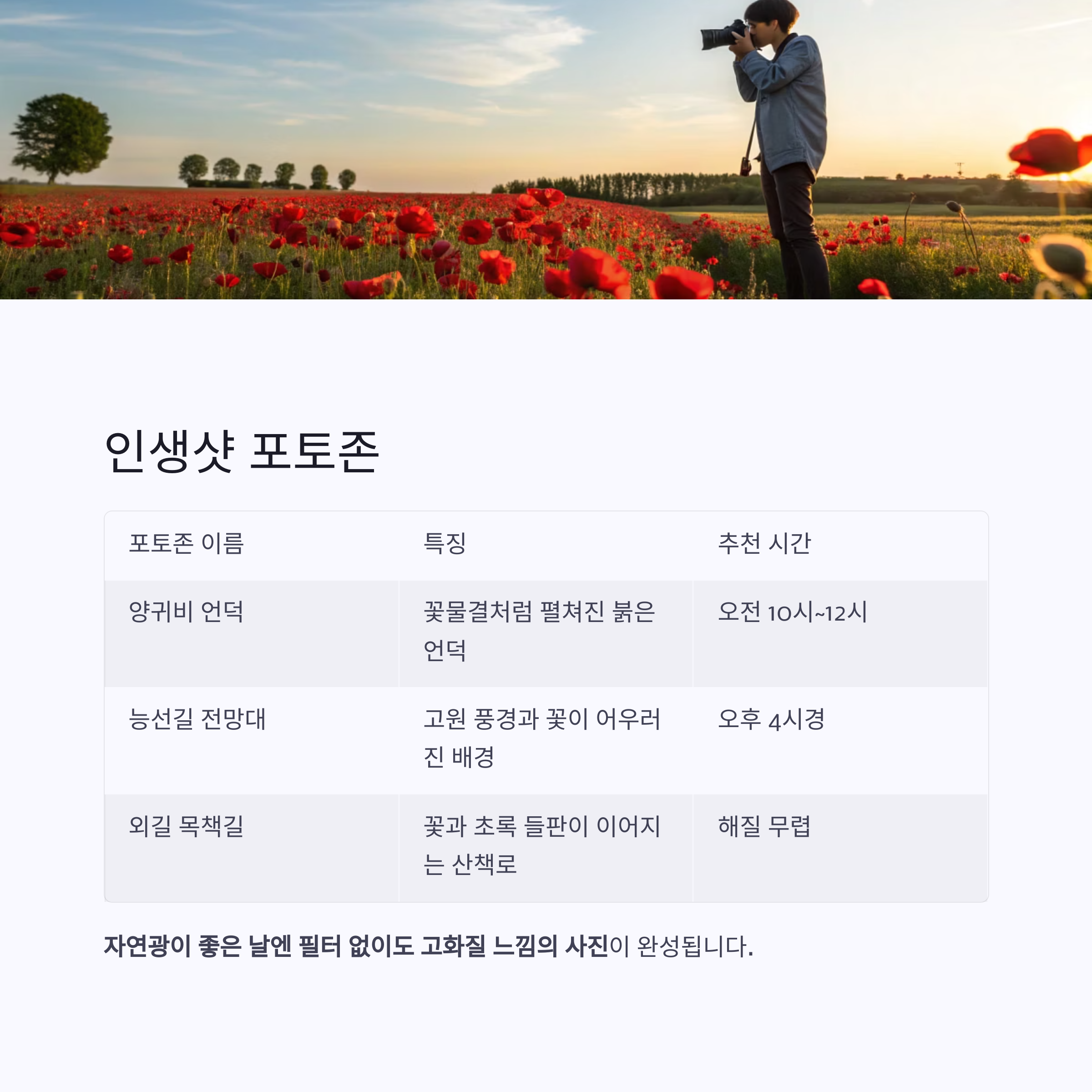 | 양귀비 언덕 | 꽃물결처럼 펼쳐진 붉은 언덕 | 오전 10시~12시 |